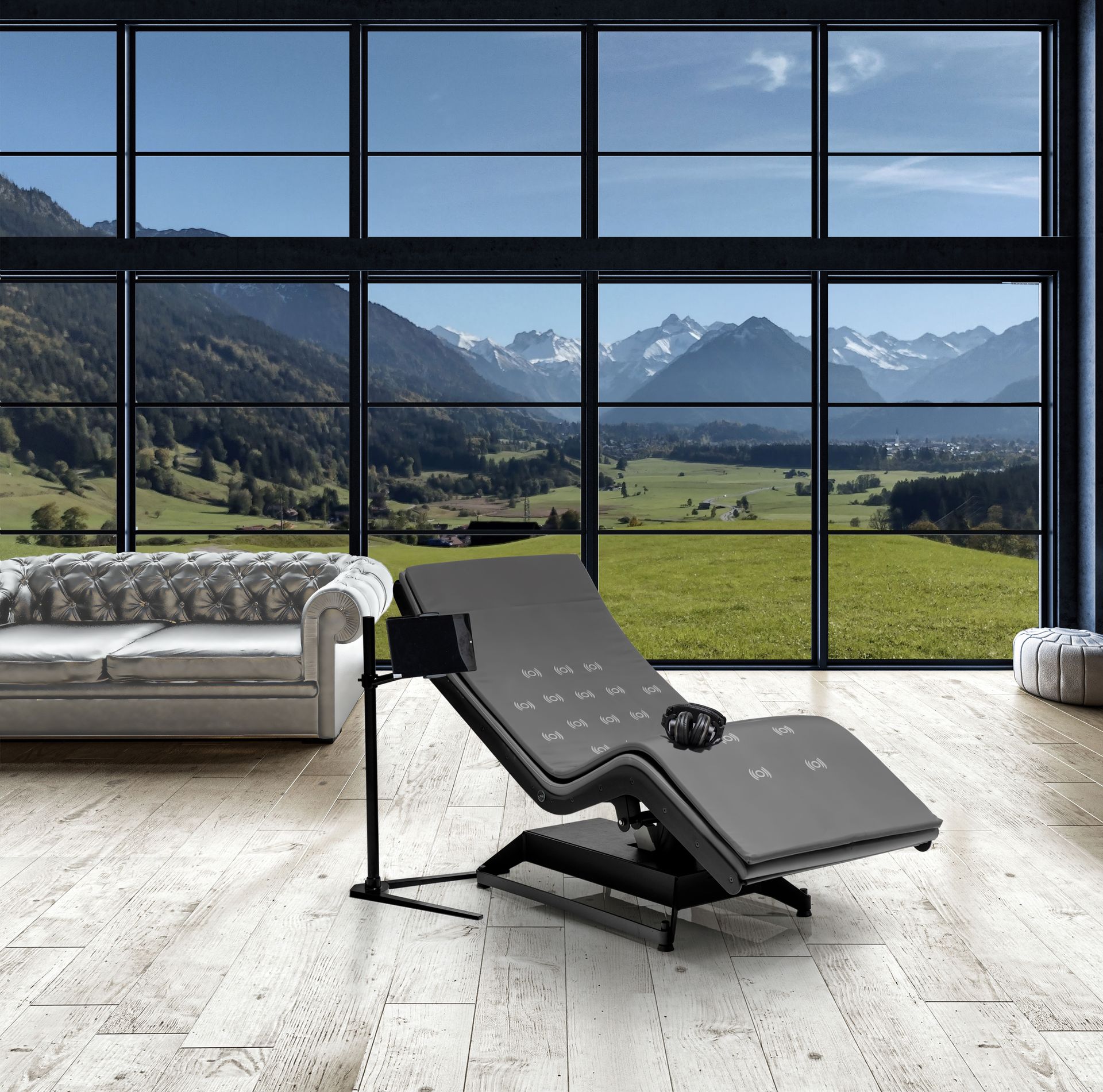 The unique patented technology includes 28 transducers integrated into the couch and controlled by the AURASENS module. The position of each transducer in the upholstery is marked with embroidery to ensure the perfect position for optimal transmission of sound and vibration.